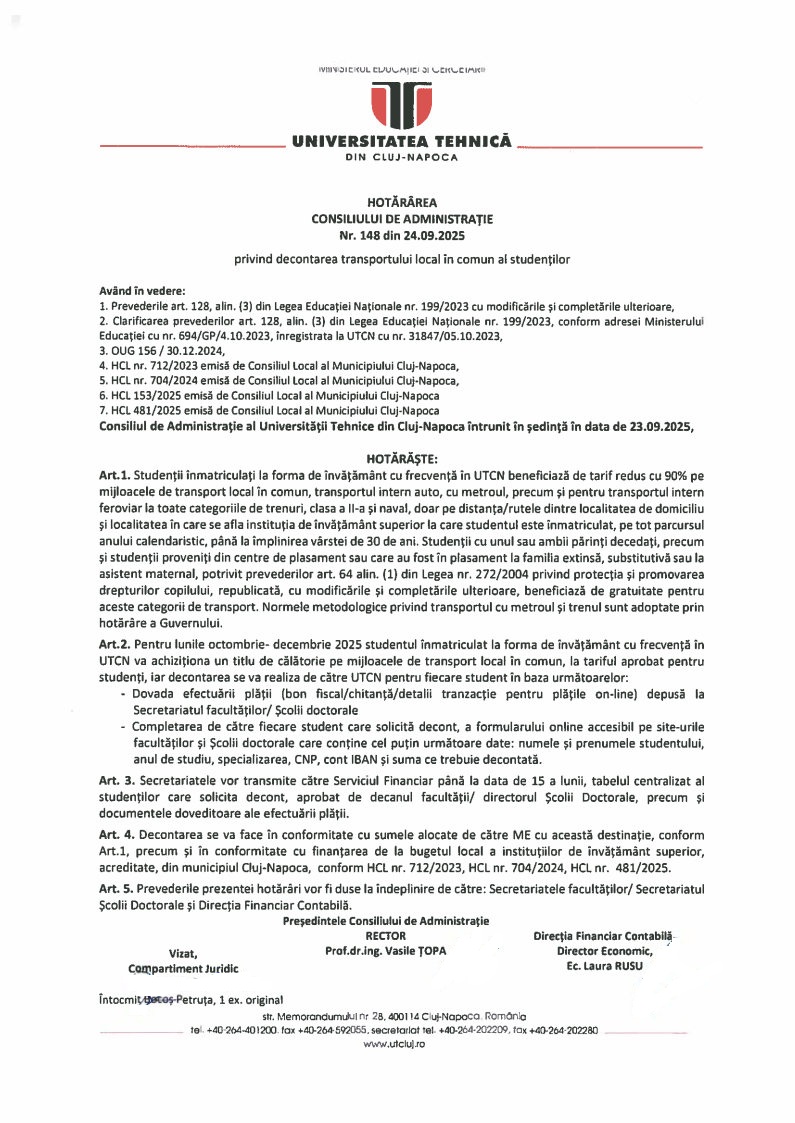 Hotărârea Consiliului de Administrație privind decontarea transportului local al studenților o găsiți aici.